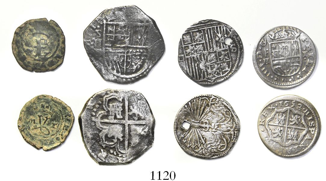 Lot of 4 Spanish cob/milled minors: 2R Seville Philip II; 1R Seville Ferdinand-Isabel assayer Gothic D to left; Toledo copper blanca Ferdinand-Isabel assayer M; and Segovia 1R 1652/28BR (unlisted overdate). Various weights. Generally AVF, the Ferdinand-Isabel 1R holed and blanca lightly encrusted, and the 2R deeply toned. The 1652/28 pedigreed to the Mark Bir collection, with his original tag.