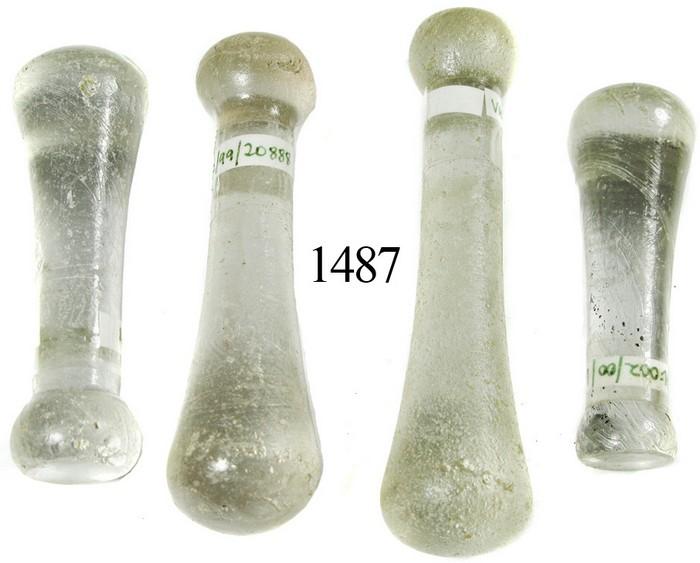 Lot of 4 glass apothecary's pestles. 192 grams total, each about 2-3/8" to 4½" long. Four small, thick, clear-glass stirrers that apothecaries used to crush and mix medicines, these all remarkably intact and easily recognizable. Recovered from: Lady Burgess, sunk in 1806 off the Cape Verde Islands, west of Africa. With Arqueonautas certificate #VAL-002/00/16149, /99/20888, /00/16221.