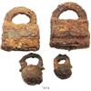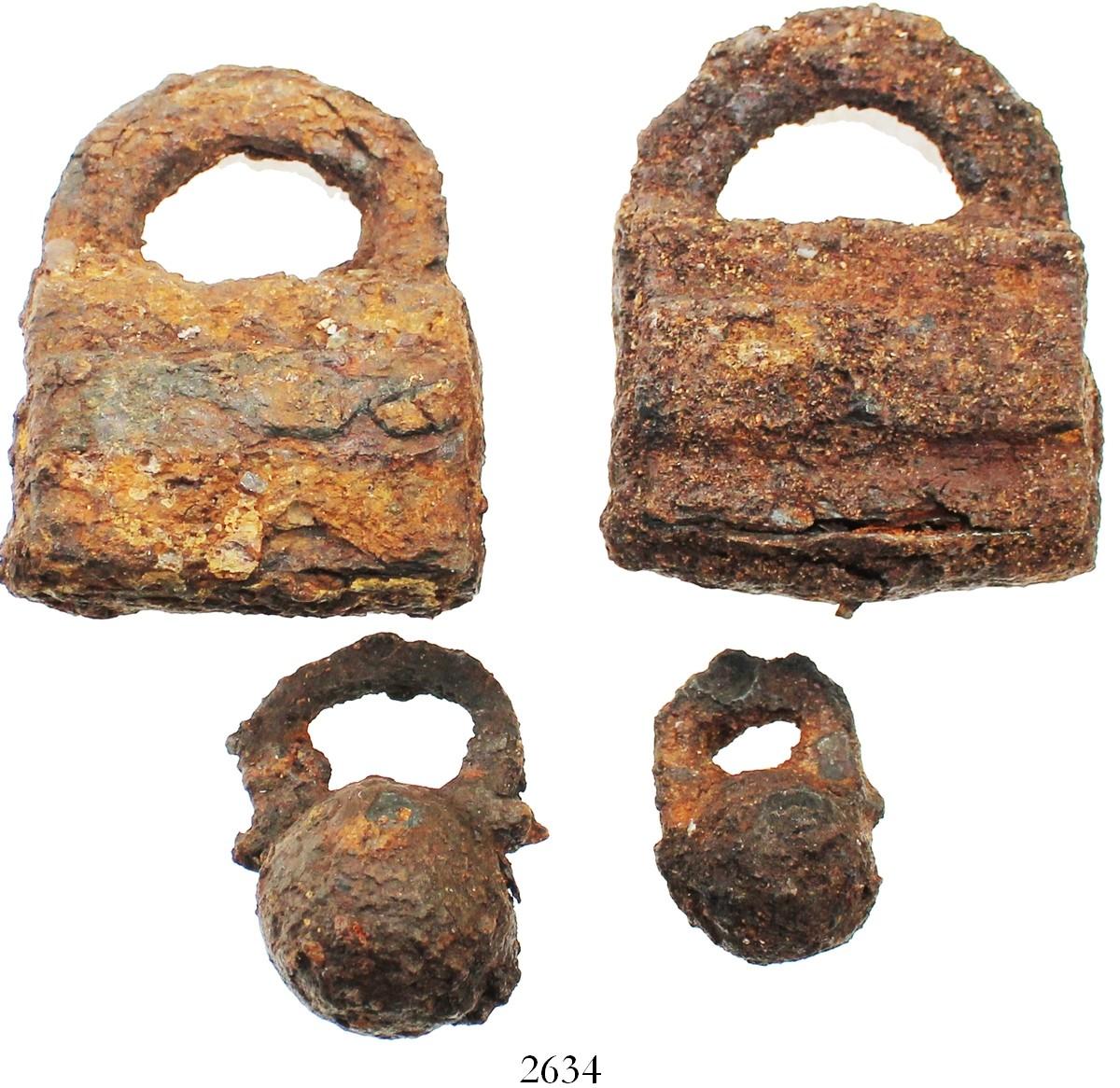 Lot of 4 iron padlocks (2 square and 2 spherical), Spanish colonial (1500s-1600s). 318 grams total, approx. 1" to 2-5/8" each. All rusty and crusty but intact and solid, interesting to show the designs in use in the colonial period, including a tiny one that hardly seems like much of a deterrent. From a colonial site in the southern Caribbean.