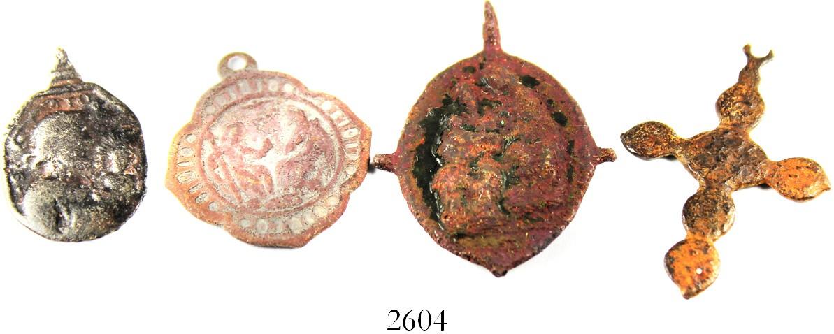 Lot of 4 small, copper/bronze, religious items: one cross and three medallions, Spanish colonial (1600s-1700s). 9.4 grams total, each approx. 1/2" to 1-1/4". Mostly worn and crusty, the top-loop intact on 2 of the medallions, typical religious scenes. From a colonial site in the southern Caribbean.