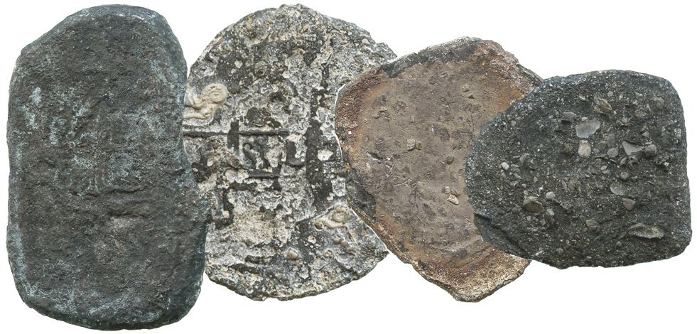 Lot of 4 uncleaned cobs (two 8R and two 4R), various mints. 58.2 grams total. Featureless lumps of blackened silver (as found), but with interesting encrustation, one of the 8R a Lima pillars-and-waves with colorful shell bits and one of the 4R all orange in color. With certificates #10464-67 from the salvagers. Recovered from: Unidentified early-1700s wrecks in the Bahamas