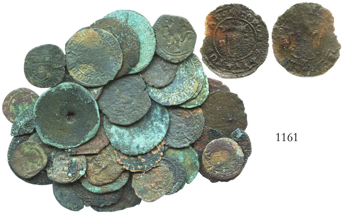 Lot of 43 miscellaneous copper coins used in local commerce in Panama in the mid-1500s, including an extremely rare Santo Domingo blanca of Charles-Joanna. 94.4 grams total. An eclectic mix of Spanish, Italian and Portuguese coins of the 1400s and early 1500s, all in corroded condition with only limited readability, vast range of colors (some green), one holed, but there is also a surprise here: a Santo Domingo blanca of Charles-Joanna (see featured coin in photo). This coin is similar to the earlier Spanish 1 maravedi, which is what Estrella (1979) called it in error, but a document from 1544 mentions the striking of "blancas de Santo Domingo" in billon (copper-silver mix) sometime between January 6, 1543 and June 10, 1544, per an order of April 15, 1541, their striking quickly discontinued due to difficulties in producing such a small coin and its rejection in commerce because of great variation in weight and size (even corroded, ours is rather large at 1.2 grams and 24 mm), depending on the ratio of copper to silver (many thanks to Jorge Proctor for archival research). Only about 6 specimens are known today (this one, in fact, the first ever offered at auction), each displaying mintmark P-S (as on our coin) or S-P flanking a crowned Gothic K (for Karolvs) on one side and anchor-shaped Y (for Yoanna) with assayer F to left on the other side, the names of the king and queen appearing in the legends on both sides.