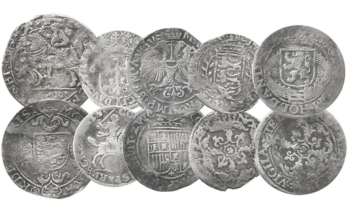 Lot of 5 Dutch small-denomination coins (schellings and stuivers), various mints and dates. 18.7 grams total. Nicely detailed and minimally corroded specimens with good toning, mostly thin and broad flans, various designs issued by Spanish and United Netherlands. Recovered from: Merestein, sunk in 1702 off South Africa