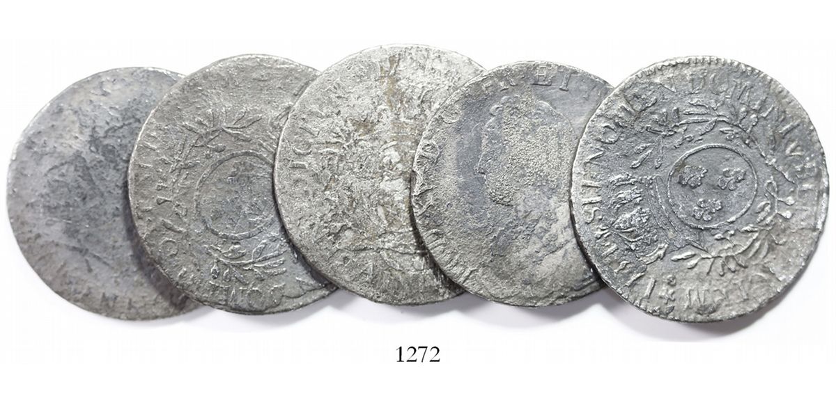 Lot of 5 French ecus of Louis XV, various dates and mints (where visible). 128.13 grams total. Moderate to heavy corrosion, mostly clear details but some dates and/or mintmarks unreadable, mostly darkly toned. Pedigreed to the Auguste Research Collection, with original certificates from the salvagers. Recovered from: Auguste, sunk in 1761 off Nova Scotia, Canada