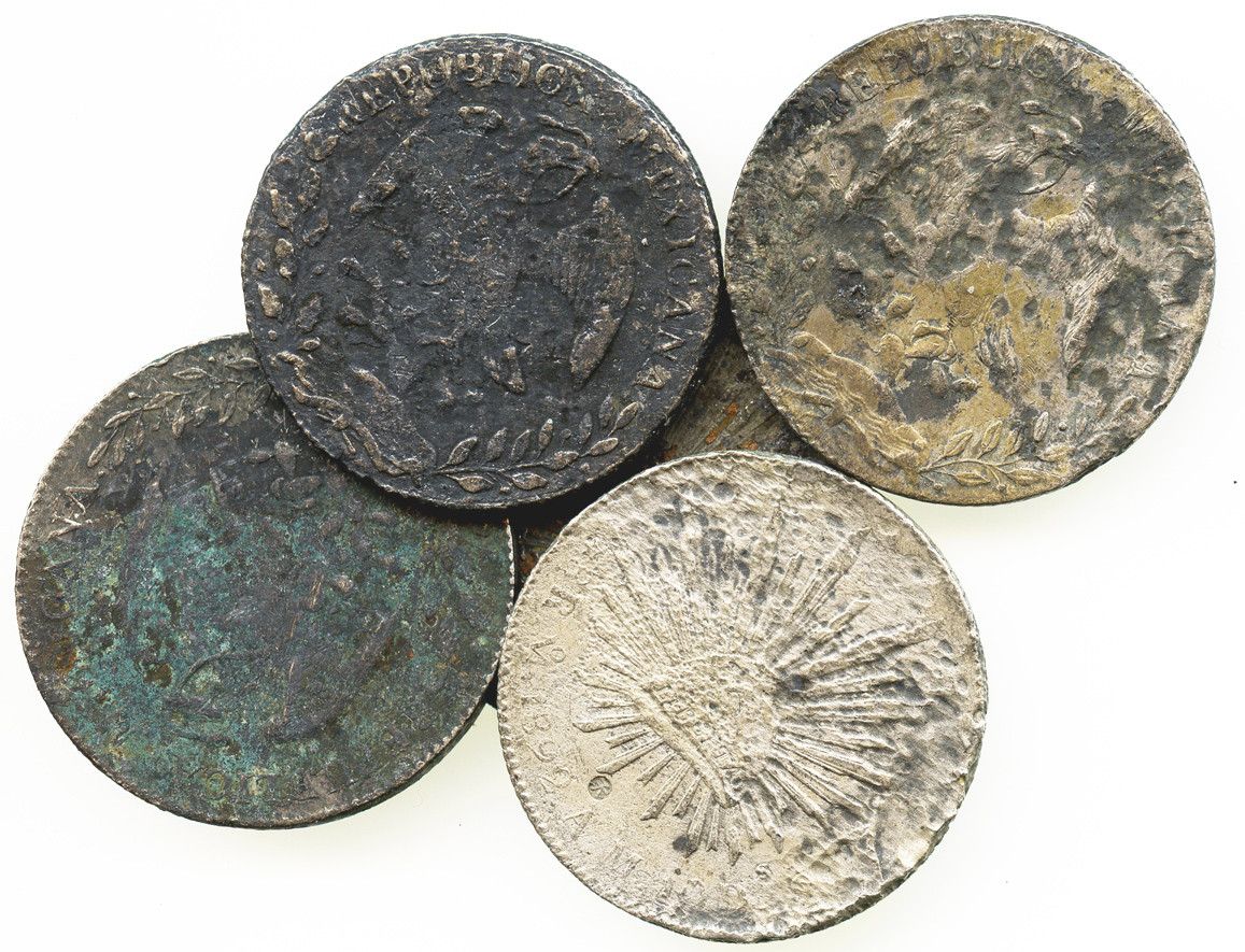 Lot of 5 Mexican cap-and-rays 8R, various mints and dates, some with chopmarks as from circulation in the Orient, all salvaged. 128.7 grams total. Mostly moderately corroded, some with encrustation and/or toning, some tiny chops, all attributed, as follows: 1863CaCH, 1877GoFR, 1890CaMM, 1892MoAM and 1895GaJS.