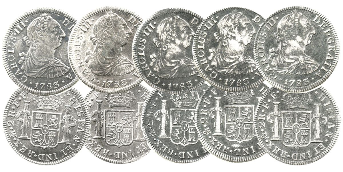Lot of 5 Mexico City, Mexico, bust 2 reales, Charles III, 1783FF, all choice condition. KM-88.2; CT-1350. 30.8 grams total. Corrosion-free XF-AU, no corrosion, nicely toned, great for jewelry. Recovered from: Cazador, sunk in 1784 off New Orleans in the Gulf of Mexico