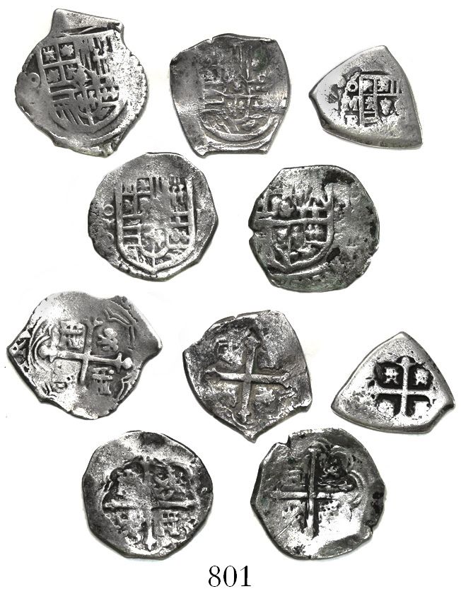 Lot of 5 Mexico City, Mexico, cob 2 reales, various periods (Philip IV to Philip V) and assayers (where visible). 32.95 grams total. Good shields and crosses, some toning, Fine on average.