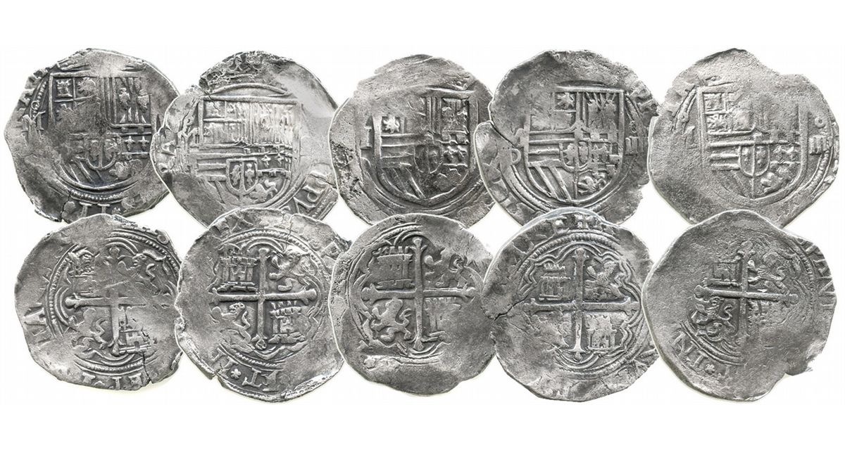 Lot of 5 Mexico City, Mexico, cob 4 reales, Philip II, assayers O or F (where visible). KM-36. 66.6 grams total. Nice specimens with good full shields and crosses, most with clear mintmarks and assayers, minimal to light surface corrosion only, some silvery but most with toning on fields. Recovered from: Unidentified ca.-1590 wreck off the Yucatan peninsula of Mexico