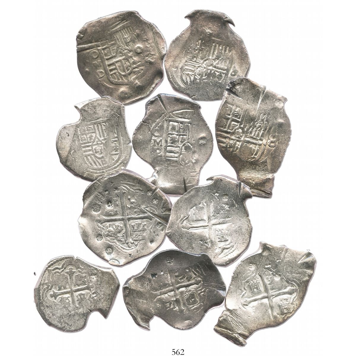 Lot of 5 Mexico City, Mexico, cob 8 reales, Philip IV, assayers D and P where visible, interesting shapes, all with chopmarks and/or test-cuts as from circulation in the Orient. 132.6 grams. Very interesting coins with good details, F-VF overall, some lightly toned.