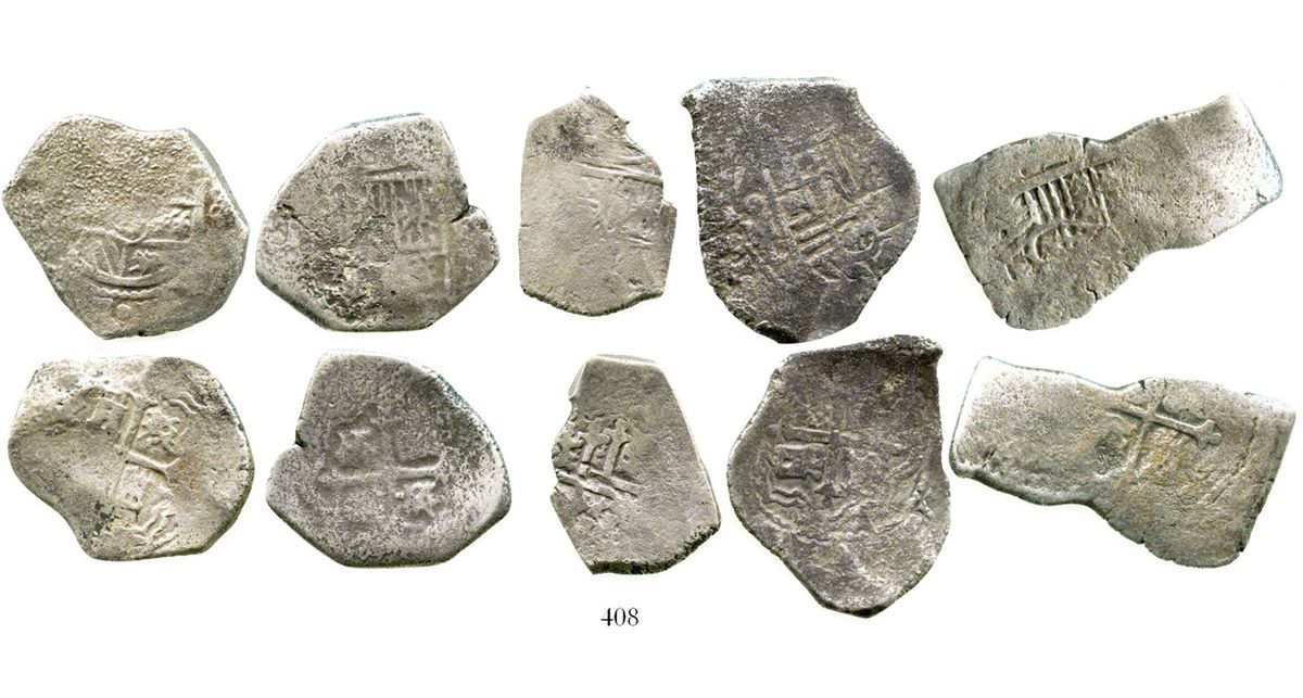 Lot of 5 Mexico City, Mexico, cobs (four 8R and one 4R), Charles II, assayer L or not visible, some interesting shapes. 94.6 grams total. Typically worn and corroded but with recognizable shields and crosses, lightly toned. With two original certificates from the salvagers. From the Joanna, sunk in 1682 off South Africa