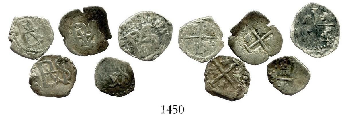 Lot of 5 Potosi, Bolivia, cob 1/2R, Philip III and IV, assayers not visible. 0.8 to 1.5 grams each. Generally good crosses and monograms, F-VF on average, a couple rusty and one salvaged but no holes.