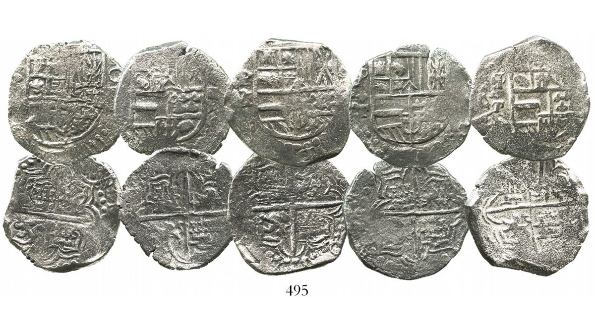 Lot of 5 Potosi, Bolivia, cob 4 reales, Philip III, assayer T or not visible, all Grade 1. KM-9. 61.5 grams total. Light corrosion only, with generally good shields and crosses. With Fisher certificates #105856, 114859 and 181620, and Fisher/Sinclair certificates #114024 and 219952. Recovered from: Atocha, sunk in 1622 west of Key West, Florida