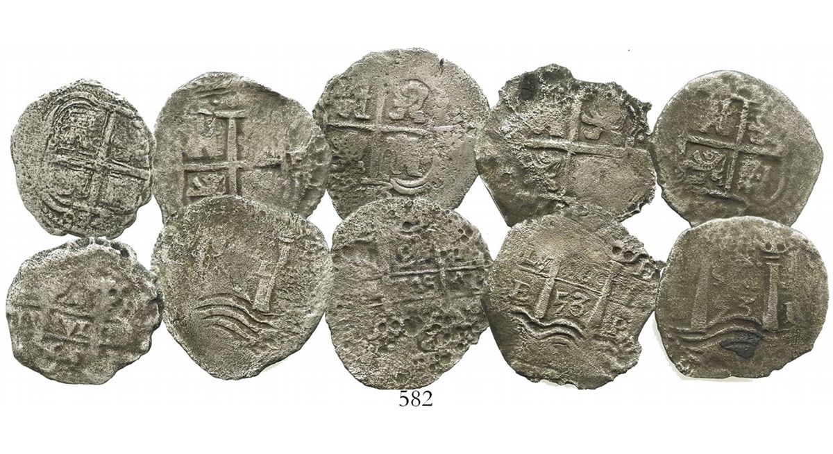 Lot of 5 Potosi, Bolivia, cob 4 reales, assayer E, dated 1653 and 1654. S-P37a; KM-18. 46.5 grams total. Moderately to heavily corroded but with clear dates and generally good crosses, all lightly toned. All with Marex numbered tags. Recovered from: Maravillas, sunk in 1656 off Grand Bahama Island
