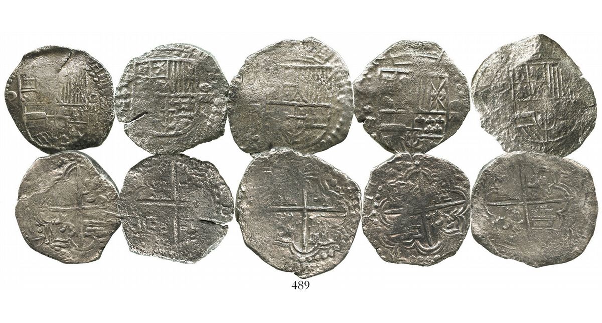 Lot of 5 Potosi, Bolivia, cob 8 reales, Philip III, various assayers (where visible), all Grade 2. KM-10. 107.3 grams total. Moderate corrosion but generally good shields and/or crosses. With Fisher certificates #152301, 188937, 189037, 191989 and 192712. Recovered from: Atocha, sunk in 1622 west of Key West, Florida