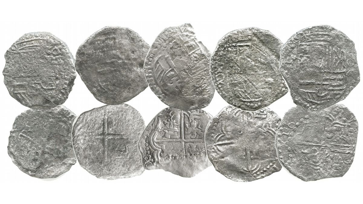Lot of 5 Potosi, Bolivia, cob 8 reales, Philip III, various assayers (where visible), all Grade 3. 100.2 grams total. Generally decent shields and crosses, mostly moderately corroded, one with partial date. With Fisher certificates #189184, 190866, 193906, 201936 and 267162. Recovered from: Atocha, sunk in 1622 west of Key West, Florida