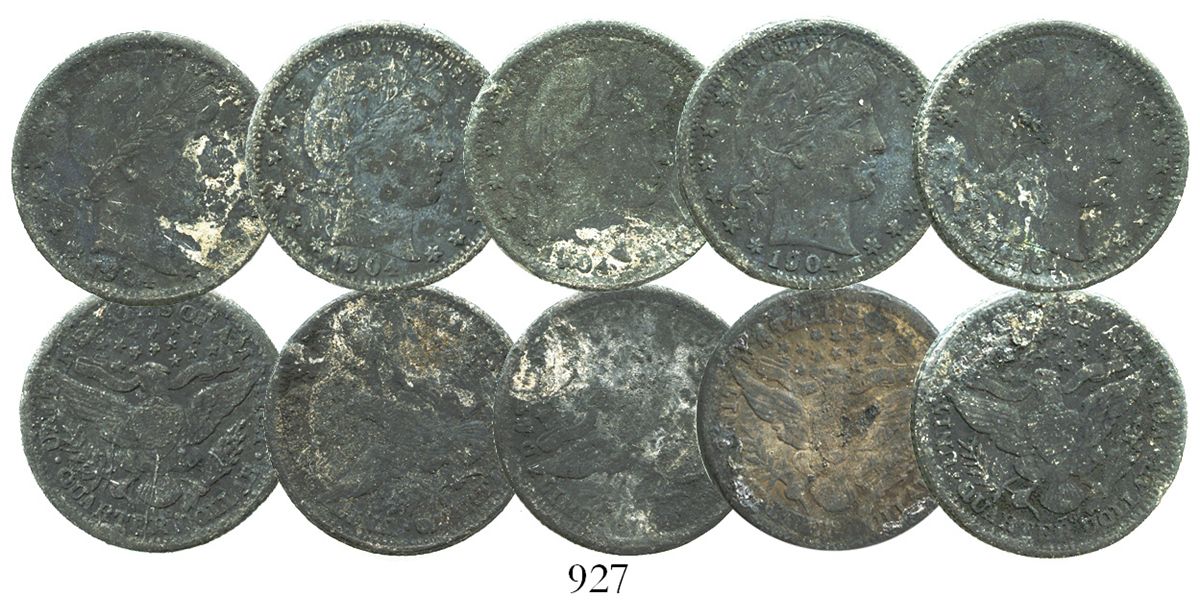 Lot of 5 USA (Philadelphia and New Orleans mints), Barber quarters, all dated 1904, encrusted as found. KM-114. 24.0 grams total. Very dark but readable, with areas of light-gray and tannish crust. With certificates. Recovered from: "Sulphur Springs recovery" (early 1900s) near Tampa, Florida