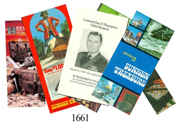 Lot of 5 brochures and 1 postcard pertaining to the Real Eight museum in Cape Canaveral, plus a memorial flyer for Dan Thompson and a Duke Long publicity card. Various modern memorabilia related to the Real Eight Co. and two of its members (Dan Thompson and Duke Long), mostly tourist brochures.