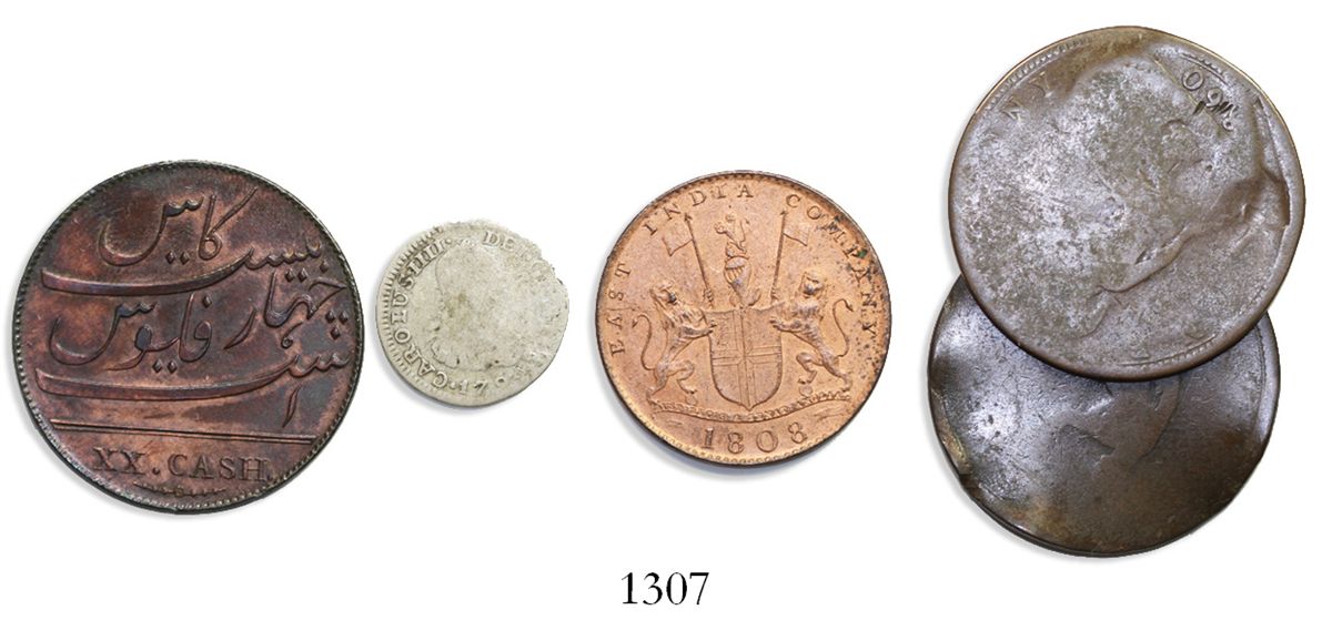 Lot of 5 coins (4 copper and 1 silver) from various 1800s-1900s wrecks, some rare, as follows: Admiral Gardner (1809); Folcon (1851); and Florizel (1918). 32.08 grams total. Uncorroded coins (the Florizel pieces worn), most from seldom-seen wrecks (the 1/2R from the Folcon particularly interesting) supported by original certificates. All with hand-signed certificates from the salvagers. Recovered from: Miscellaneous wrecks
