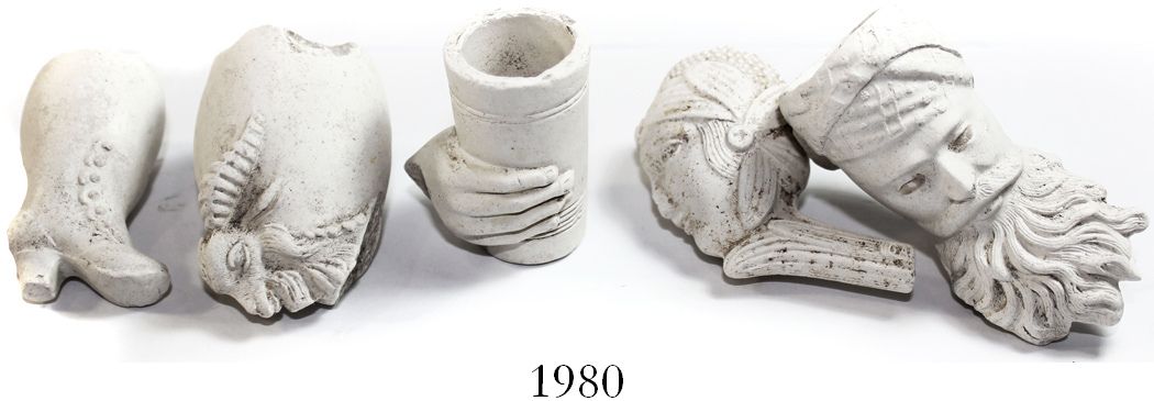 Lot of 5 figural clay smoking-pipe bowls, European, mid-1800s, rare designs. 112 grams total, up to 2" long. Fascinating little collection of different figures in bright white clay, from whole heads to a hand holding a cup to a single-booted fat leg, all intact except for a chip here and there, but the straight tube parts missing. With photo-certificate.