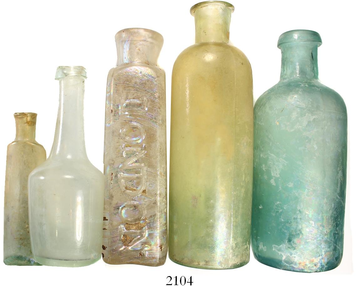 Lot of 5 glass medicine bottles, ca. 1850, found in and around the Florida Keys. From 26 to 200 grams each; 4" to 6-1/2" tall and 1" to 2" in diameter. Great mix of different shapes and colors (one embossed with LONDON), all with open pontils, some pearly and swirled surfaces and light encrustation, all fully intact with no chips, cracks or stars.