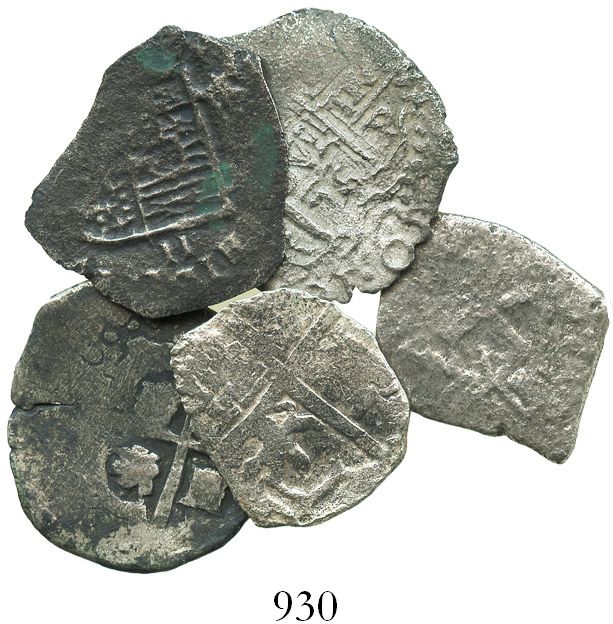 Lot of 5 miscellaneous cob 2 reales from well-known wrecks, as follows: "Rill Cove" (ca. 1618), Atocha (1622), Capitana (1654), 1715 Fleet (two). 20.2 grams total. Good cross-section of wrecks in a popular denomination (the Atocha coin actually probably a 4R fragment), one of the Fleet coins dated 1696 (Potosi), with corrosion ranging from minimal to heavy. The Atocha coin and Mexican 1715-Fleet coin with original Mel Fisher certificates. Recovered from: Miscellaneous wrecks
