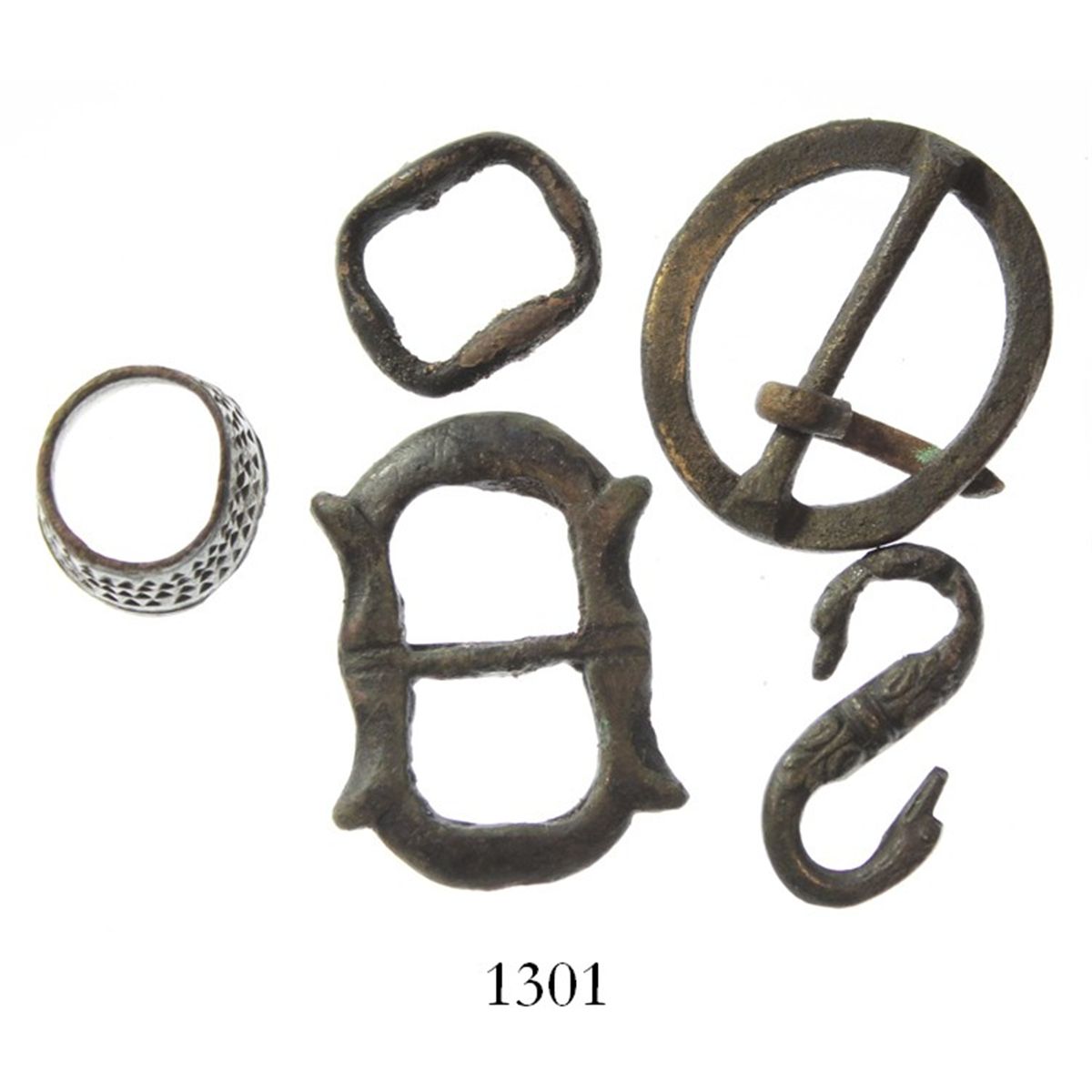 Lot of 5 small, cuprous artifacts, including 3 buckles, 1 thimble and 1 S-shaped link.
