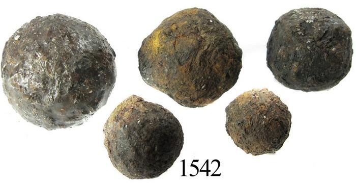 Lot of 5 small iron cannonballs. Over 2 lb total, 1" to 1¾" in diameter. Five rusty but stabilized balls of varying sizes, just like the ones you see from shipwrecks. Found in a Spanish colonial area in the southern Caribbean, ca. 1590.