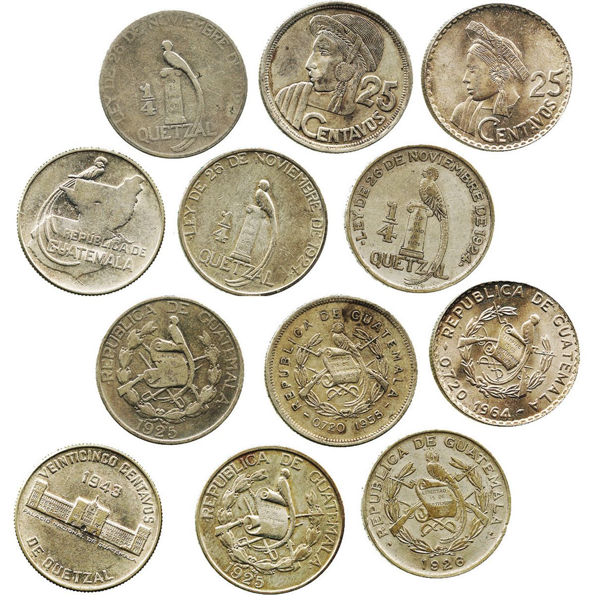 Lot of 6 Guatemala 25 centavos: 1925 (2), 1926, 1943, 1958 and 1964. 49.6 grams total. VF to Mint State, some with traces of toning, nice mix of types.