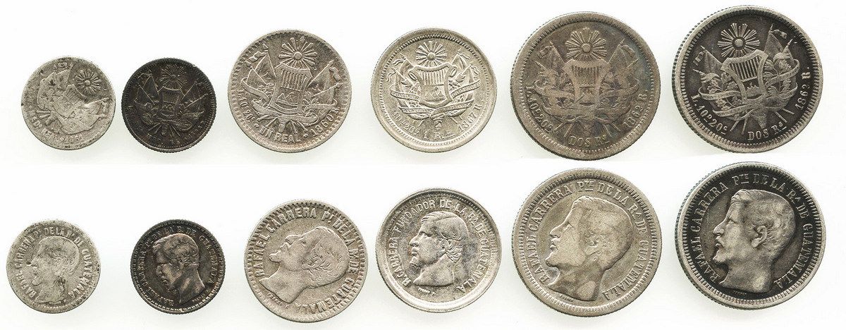 Lot of 6 Guatemala minors under Carrera (all assayer R): 2R 1860 and 1862 (2); 1R 1860 and 1867; and 1/2R 1861 and 1865. 20.9 grams total. AVF to XF, mostly nicely toned, the 1867 lustrous.