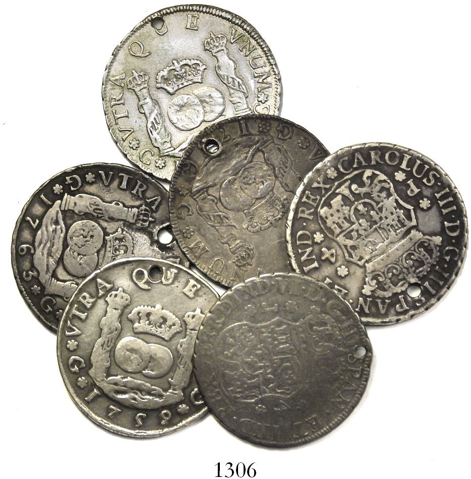 Lot of 6 Guatemala pillar 4 reales, Ferdinand VI and Charles III, various dates (1755J, 1756J, 1759P, 1761P, 1763P and 1768P). 78.79 grams total. All holed but with decent details, mostly toned, AVF on average.