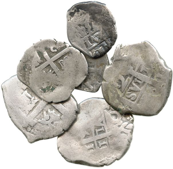 Lot of 6 Lima, Peru, cob 2R and 1R, Philip V to Ferdinand VI, various dates. 25.9 grams total. Three of each denomination, lightly toned Fine+ on average, all with at least partial dates visible, no holes or corrosion.