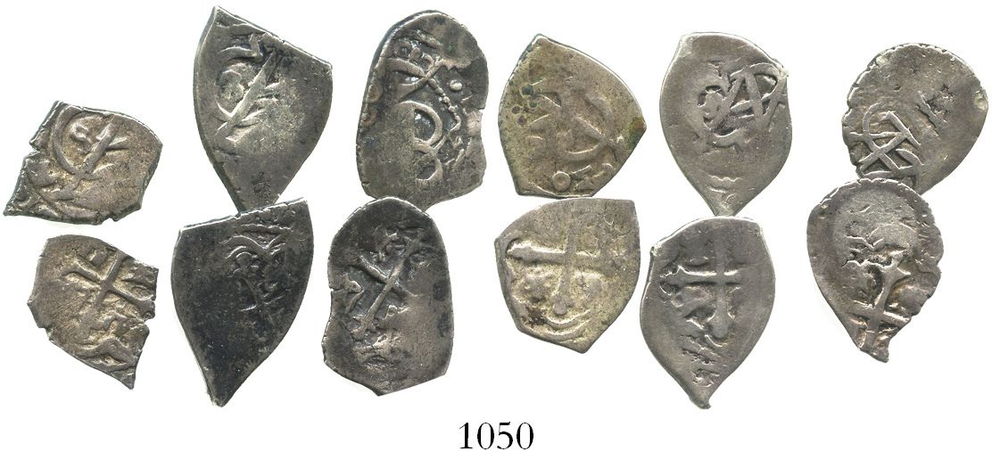 Lot of 6 Mexico City, Mexico, cob 1/2R of Charles II (assayer L or not visible), showing 6 different parts of the monogram. 9.2 grams total. A neat little set put together by the consignor specifically to show all the parts of the monogram, all with at least decent crosses too, mostly toned, F-VF.