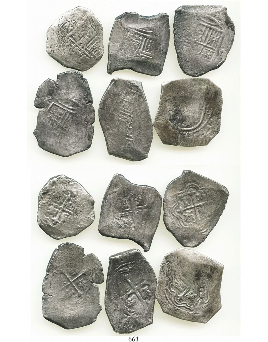 Lot of 6 Mexico City, Mexico, cob 8 reales of Charles II, assayer L or not visible KM-46. 130.5 grams total. Typically crudely struck (much flatness) and most thin from corrosion but all with at least some details and a few interesting shapes. With original (generic) certificates from the divers. Recovered from: Joanna, sunk in 1682 off South Africa
