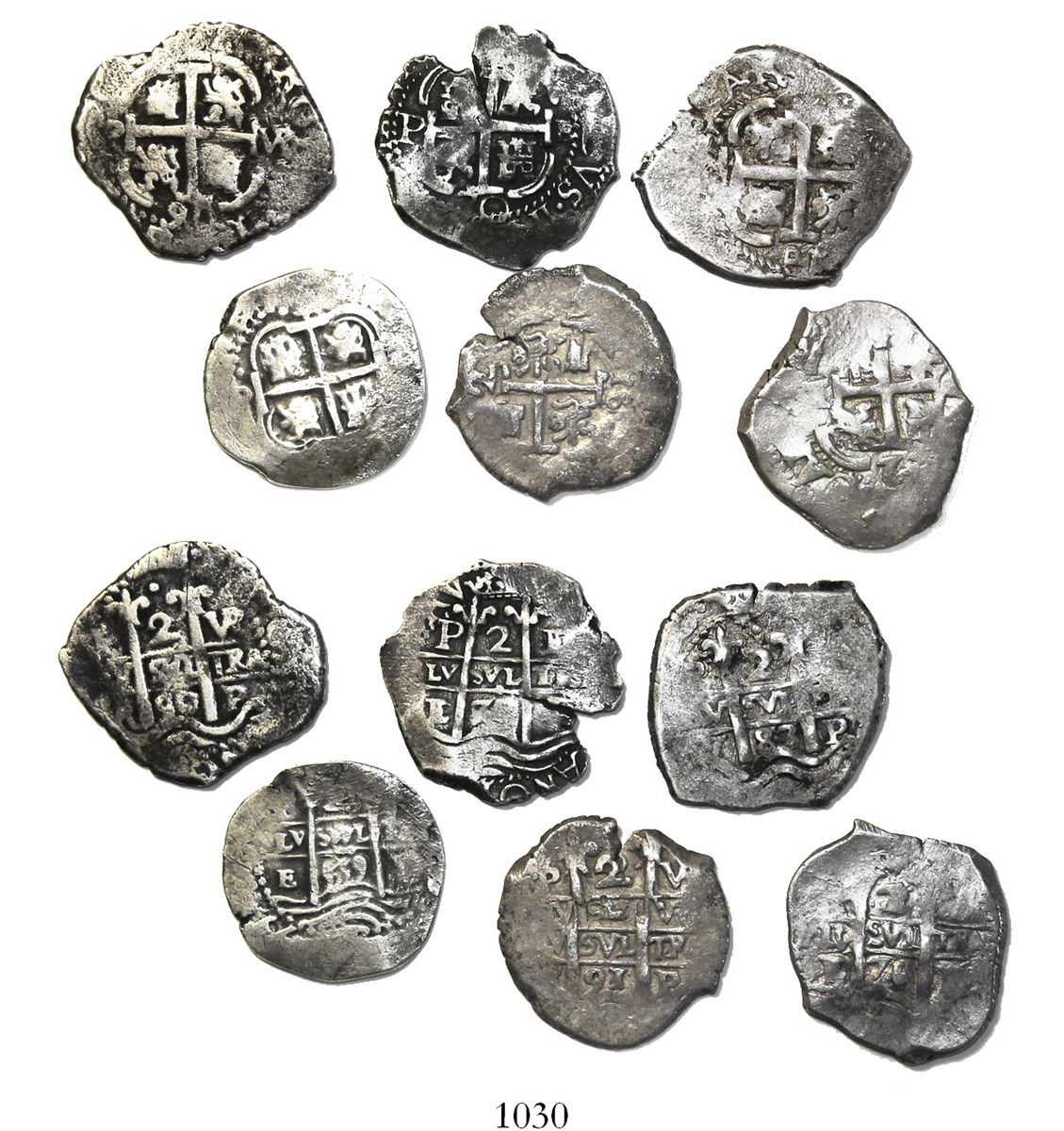 Lot of 6 Potosi, Bolivia, cob 2 reales, Philip IV and Charles II, dates as follows: 1659E, 1670E, 1676E, 1683V, 1690VR and 1691VR. 38.37 grams total. Well-detailed AVF on average, all with clear dates and generally good crosses and shields, no major damage, some toned.