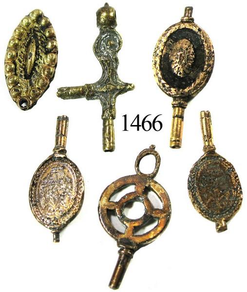 Lot of 6 cuprous watch keys and fobs. 12.0 grams total, each about 1". Mostly oval (one round and one cross-shaped), most with cylindrical protrusions for winding pocket-watches, the designs somewhat ornate and still very clear despite centuries under the sea (in fact intact, and nicely brassy in color), therefore somewhat rare even if small and of minimal intrinsic value. Recovered from: Hartwell, sunk in 1787 off the Cape Verde Islands, west of Africa.