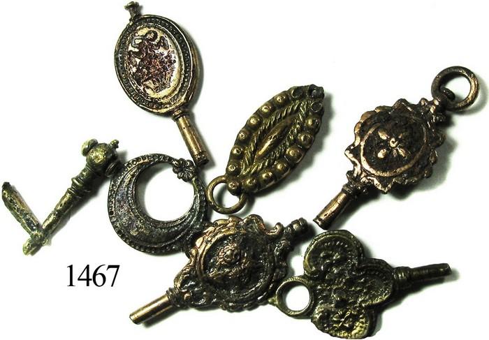 Lot of 6 cuprous watch keys and fobs. 15.9 grams total, each about 1". Mostly oval (one round and one club-shaped), most with cylindrical protrusions for winding pocket-watches, the designs somewhat ornate and still very clear despite centuries under the sea (in fact intact, and nicely brassy in color), therefore somewhat rare even if small and of minimal intrinsic value. Recovered from: Hartwell, sunk in 1787 off the Cape Verde Islands, west of Africa.