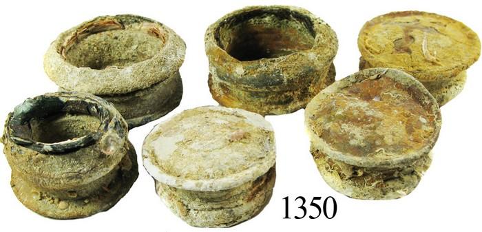 Lot of 6 large, lead bottle-caps. 1 lb 11 oz total, each about 2" in diameter and 1" tall. Much like their smaller counterparts in our time, each of these items was screwed onto the top of a glass bottle (some with the broken glass still inside the rim), only back then the bottles and caps were much bigger! Each cap is thickly encrusted (mostly white) and heavy. Recovered from: Sacramento, sunk in 1668 off the Bay of All Saints, Bahia, Brazil.
