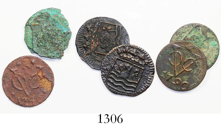 Lot of 6 (three pairs) of Dutch East India Co. copper duits from three different wrecks, one common but two very rare: Bredenhof (1753), Vlissingen (1747) and Zeeland (1793). 15.29 grams total. A very interesting set of what would appear to be cheap, common coins, but the ones from a common wreck (Bredenhof) rather choice and the other 4 (corroded and/or encrusted) from wrecks that are practically unobtainable as never officially salvaged. The two Bredenhof coins with certificates from the salvagers. Recovered from: Miscellaneous wrecks