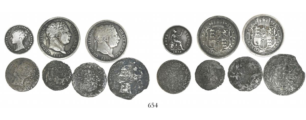 Lot of 7 British silver minors of George III through Victoria. 20.00 grams total. This lot consists of 4 small coins that are so corroded as to be thin slivers, with just enough detail to see the monarchs, in addition to 3 solid and uncorroded coins (Fine details, nicely toned), as follows: George III shillings (2) dated 1816 and Victoria groat dated 1854. Recovered from: Unidentified mid-1800s wreck in the English Channel