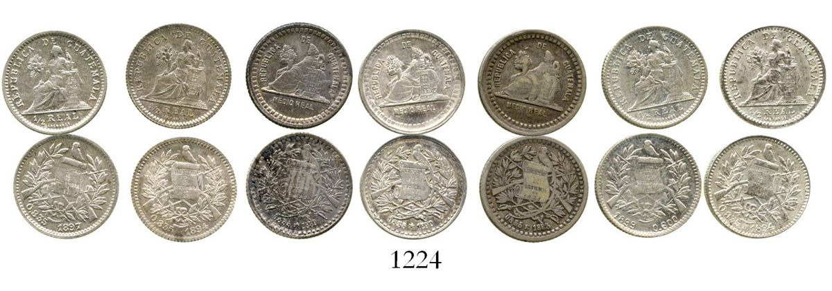 Lot of 7 Guatemala 1/2R of 1883-1899, various minor varieties of two different types. KM-155.1 and 155.2. 10.7 grams total. All AU-UNC and mostly lustrous except for one, an 1883/1 in VF, all problem-free and great for advanced study.
