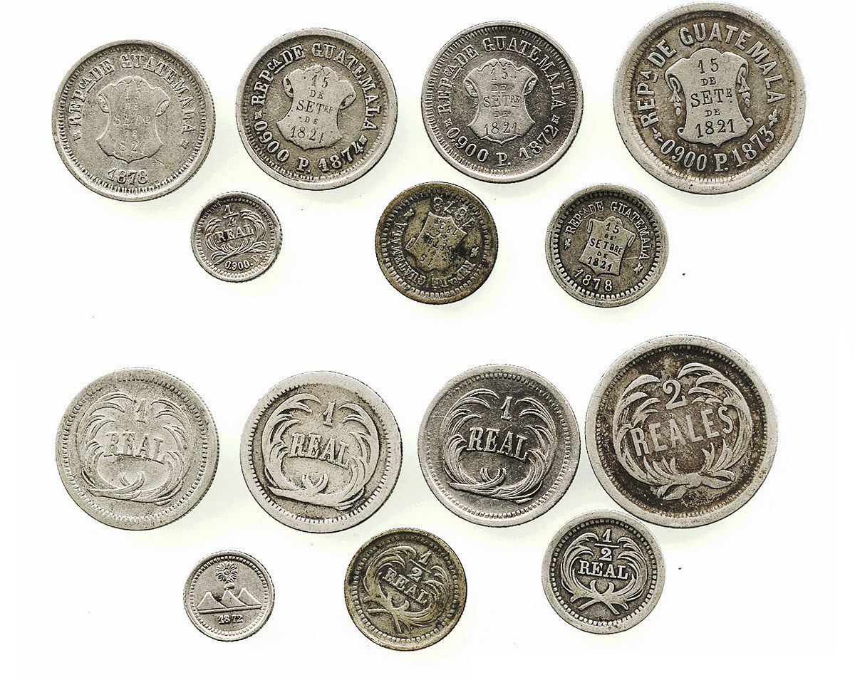 Lot of 7 Guatemala minors of the 1870s: 2R 1873P; 1R 1872P, 1874P and 1878; 1/2R 1878 (2); and 1/4R