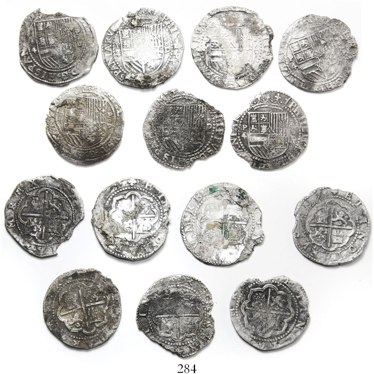 Lot of 7 Lima, Peru, cob 4 reales, Philip II, assayer Diego de la Torre, various varieties. S-L4; KM-11. 84.44 grams total. Choice details but all with corrosion on surfaces or around edges, mostly nicely toned, a few with bits of coral encrustation. Recovered from: Unidentified ca.-1590 wreck off the Yucatán peninsula of Mexico