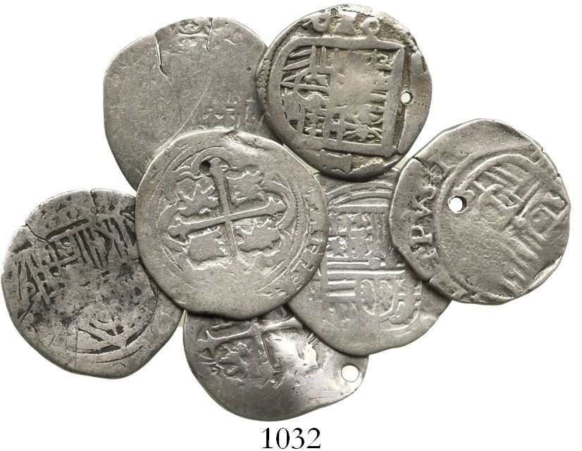 Lot of 7 Mexico City, Mexico, cob 1R, Philip II and III, assayers O, F and D (where visible). 21.0 grams total. All a bit worn (AVG to Fine) and all holed except for one with edge-splits (also one bent and slashed), but generally decent shields and/or crosses.