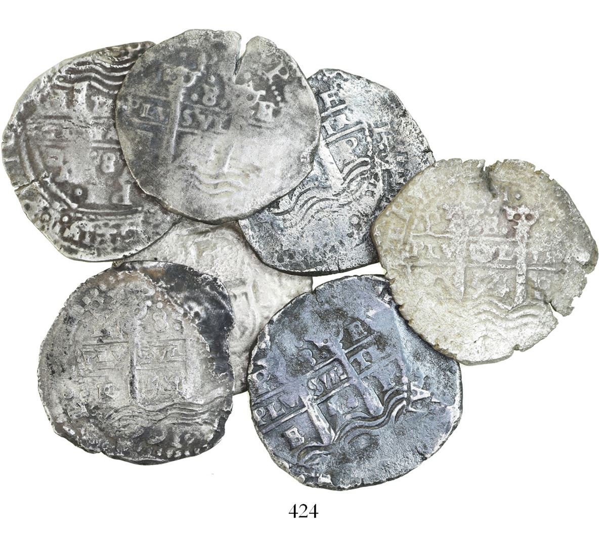 Lot of 7 Potosi, Bolivia, cob 8 reales, all dated 1654, assayer E. S-P37a; KM-21; CT-438. 144.67 grams. All moderately to heavily corroded but with clear dates and other details, also mostly nicely toned. Recovered from: Capitana, sunk in 1654 off Chanduy, Ecuador