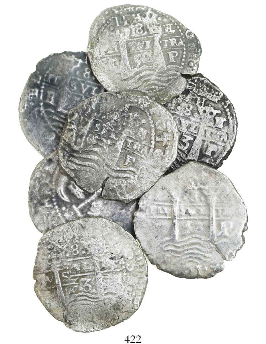 Lot of 7 Potosi, Bolivia, cob 8 reales, dated 1652 and 1653, assayer E. S-P37a; KM-21. 130.52 grams total. All moderately to heavily corroded but with clear dates and other details, also mostly nicely toned. Recovered from: Capitana, sunk in 1654 off Chanduy, Ecuador