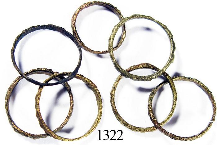 Lot of 7 bronze rings. 6.6 grams, each about ¾" in diameter. Seven thin and fairly plain (modest design only) rings of fairly large diameter that are fragile but probably still wearable as intact, just a bit worn, somewhat brassy in color. Recovered from: "Cidade Velha wrecks," sunk in the late 1500s off the Cape Verde Islands, west of Africa. With Arqueonautas certificate #AGO-050/98/956.01, 876.01, 922.03.
