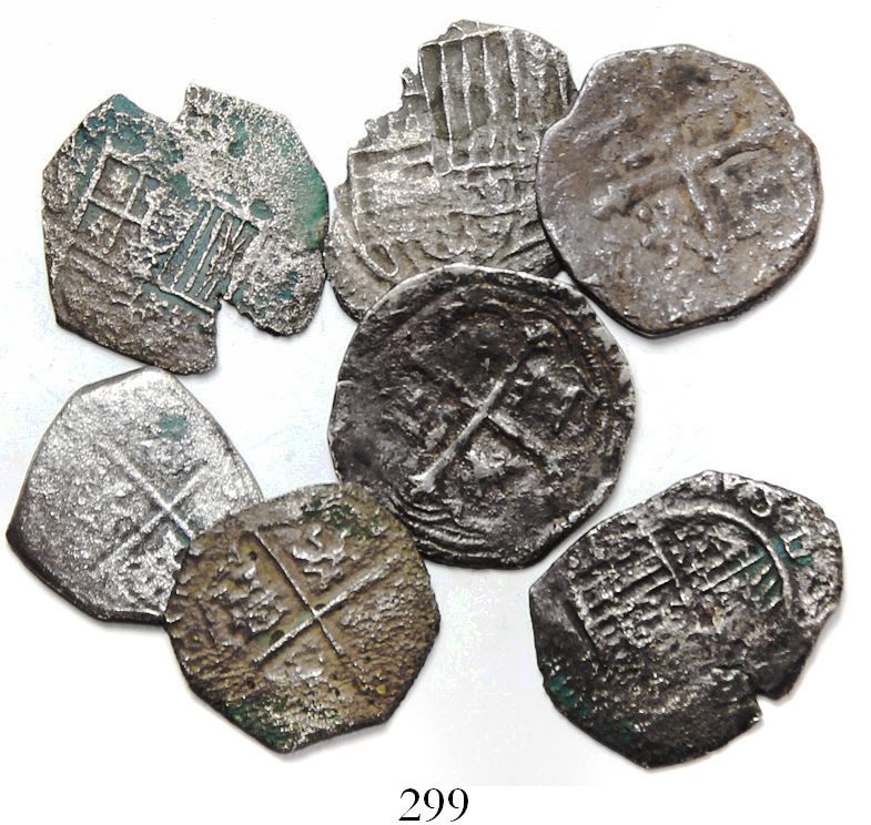 Lot of 7 cob 2 reales of Mexico and Spain, Philip II and III. 25.14 grams total. All corroded and mostly thin but with clear shields and/or crosses, darkly toned. Recovered from: "Rill Cove wreck," sunk ca. 1618 off Cornwall, England