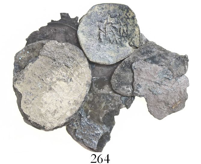 Lot of 7 fragments, all but one Mexican silver coins of Charles-Joanna but the last item some kind of copper token or button. 10.52 grams total. Faint wisps of coins, barely recognizable as such (due to corrosion), all uncleaned and dark. Recovered from: Spanish 1554 Fleet off Padre Island, Texas