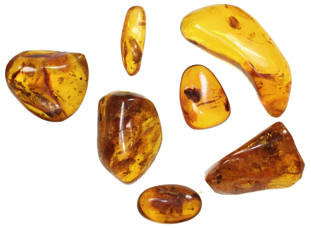 Lot of 7 pieces of amber with small insects inside, found in the Dominican Republic (approx. 20 to 30 million years old). 49 grams total, approx. 1-1/4" to 2-1/4" each. Four big pieces and three smaller chunks, all nicely polished and opaque, most with tiny insects and other debris preserved inside.