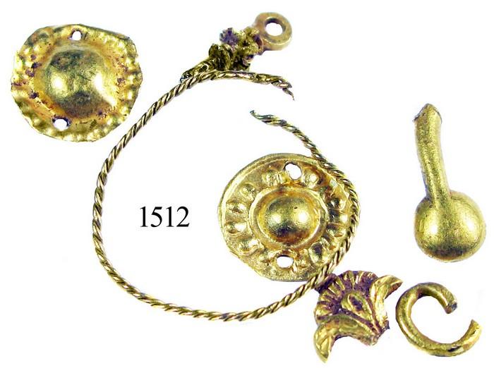 Lot of 7 small gold jewelry pieces. 1.6 grams total. A hodge-podge of small and mostly intricate pieces in high-grade gold, ranging from a thin twisted-wire ring to an embossed medallion. Found in a Spanish colonial area in the southern Caribbean, ca. 1590.